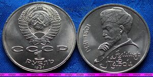 ГлавнаяМОНЕТЫЮбилейные монеты СССР → 1 рубль 1991г 550 лет со дня рождения Алишера Навои