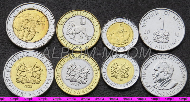 → Кения набор монет 1, 5,10 и 20 шиллингов 2010-18 год. Африканские животные Лев, Слон, Носорог. UNC
