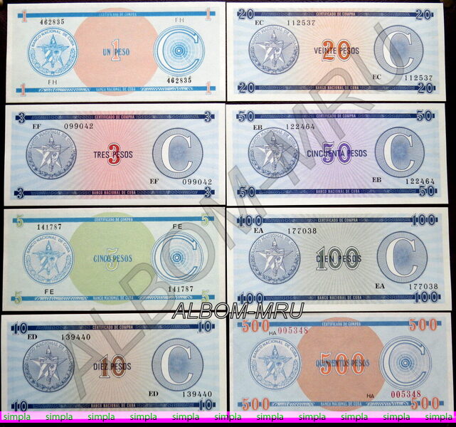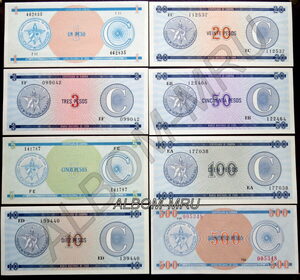 → Куба 1985 год. Набор из 7 валютных сертификатов: 1, 3, 5, 10, 20, 50,100 песо. Серия "C". 1 песо равен 1 доллару. Пресс.