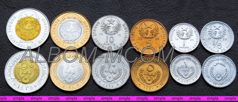 → Мавритания набор 6 монет 1973 - 2014 год. 50,20,10,5,1,1/5 угий. UNC