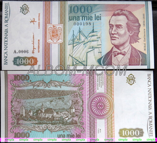 ГлавнаяБАНКНОТЫЕвропаРумыния → Румыния 1000 лей 1993 год. Серия А. Эминеску. Пресс. UNC