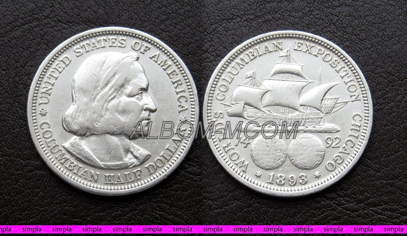 → США 50 центов 1893 год. Всемирная выставка "300-летие открытия Америки" в Чикаго. Серебро. XF+