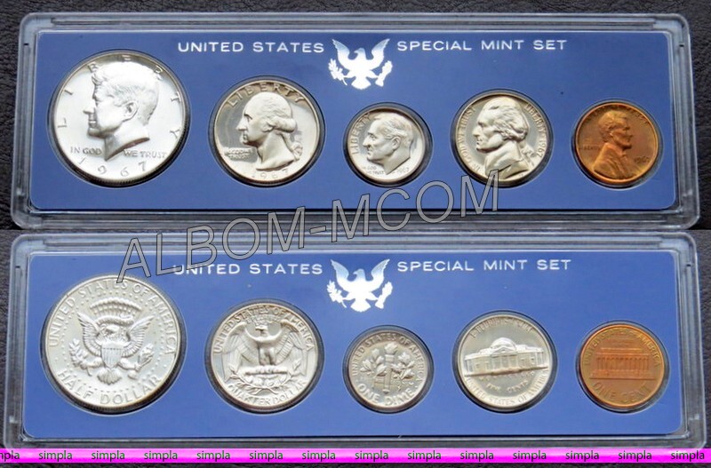 → США Годовой набор 1967 год из 5 монет: 1, 5, 10(дайм) 25 и 50 центов (Кеннеди-Серебро). Special Mint Set. Пруф-лайк.
