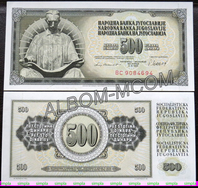 ГлавнаяБАНКНОТЫЕвропаЮгославия → Югославия 500 динар 1981 год. Пресс. UNC